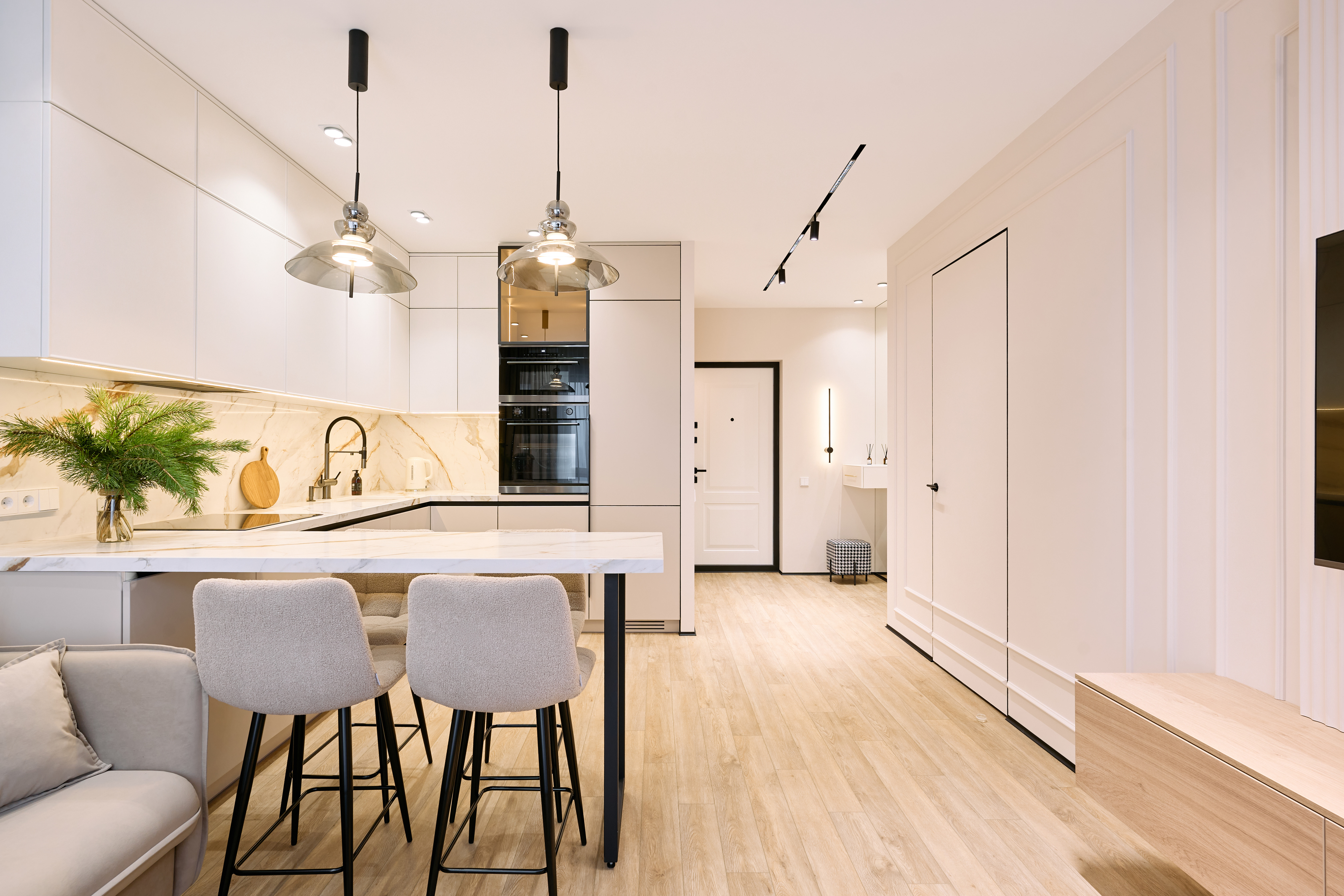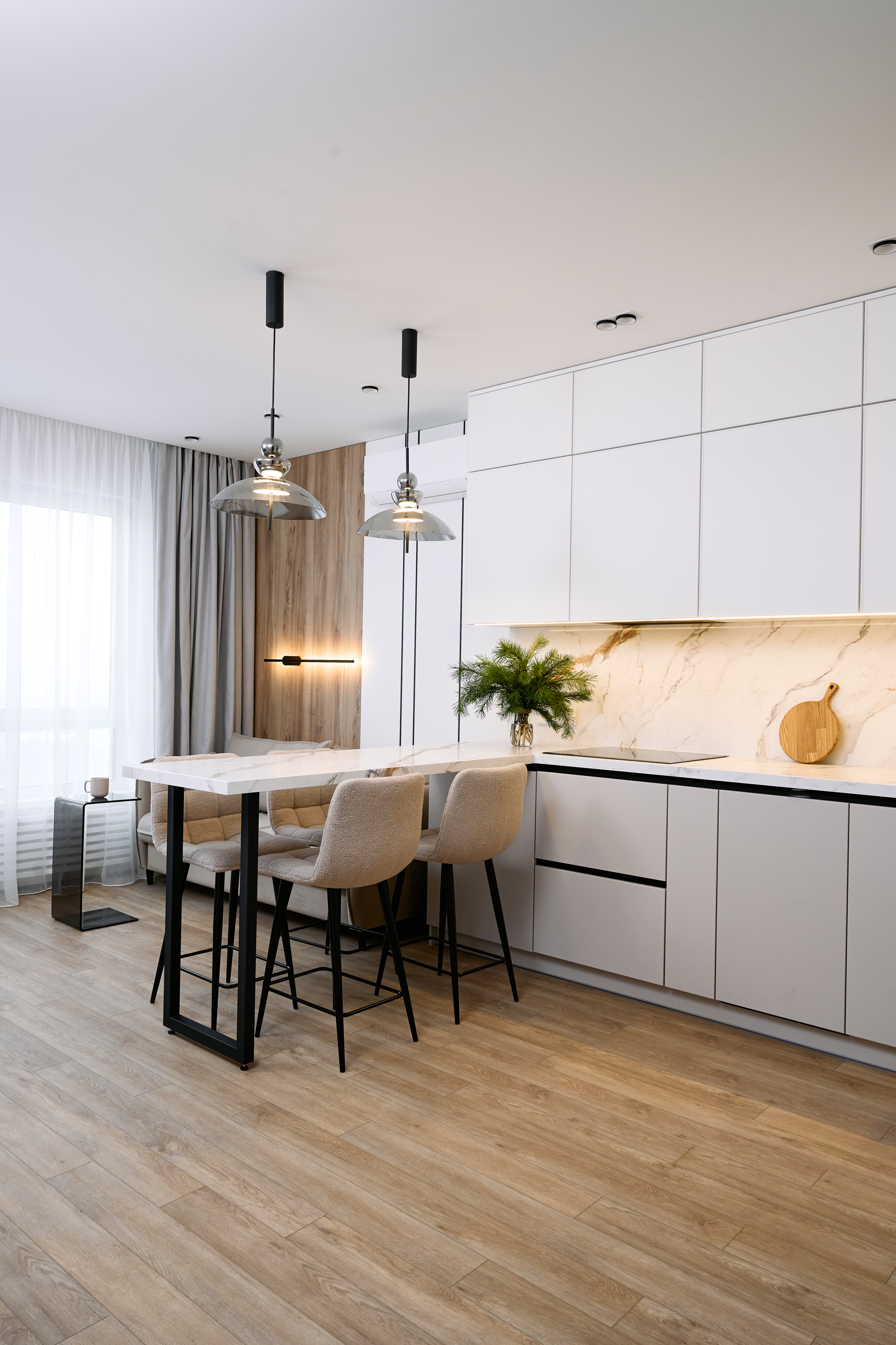 ухня с гостинной и стеновыми панелями