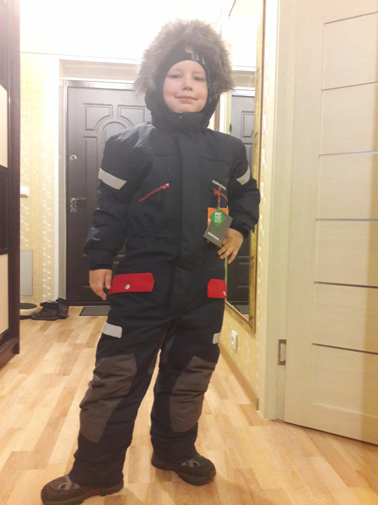 Хвастаемся и мы... Детский комбез BJO**RNEN - просто супер. Начало зимнего сезона - мокрый снег, ветер - сынуля сухой и теплый, на рост 116 - взяли 120, он большемерит на размер, штанины подвернули, молния закрыта защитной планкой, в рукавах манжеты, я довольна, ткань легко очищается от грязи. Рекомендую - суперская вещь и в соотношении цена-качество.