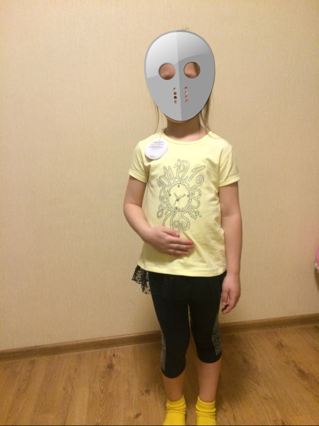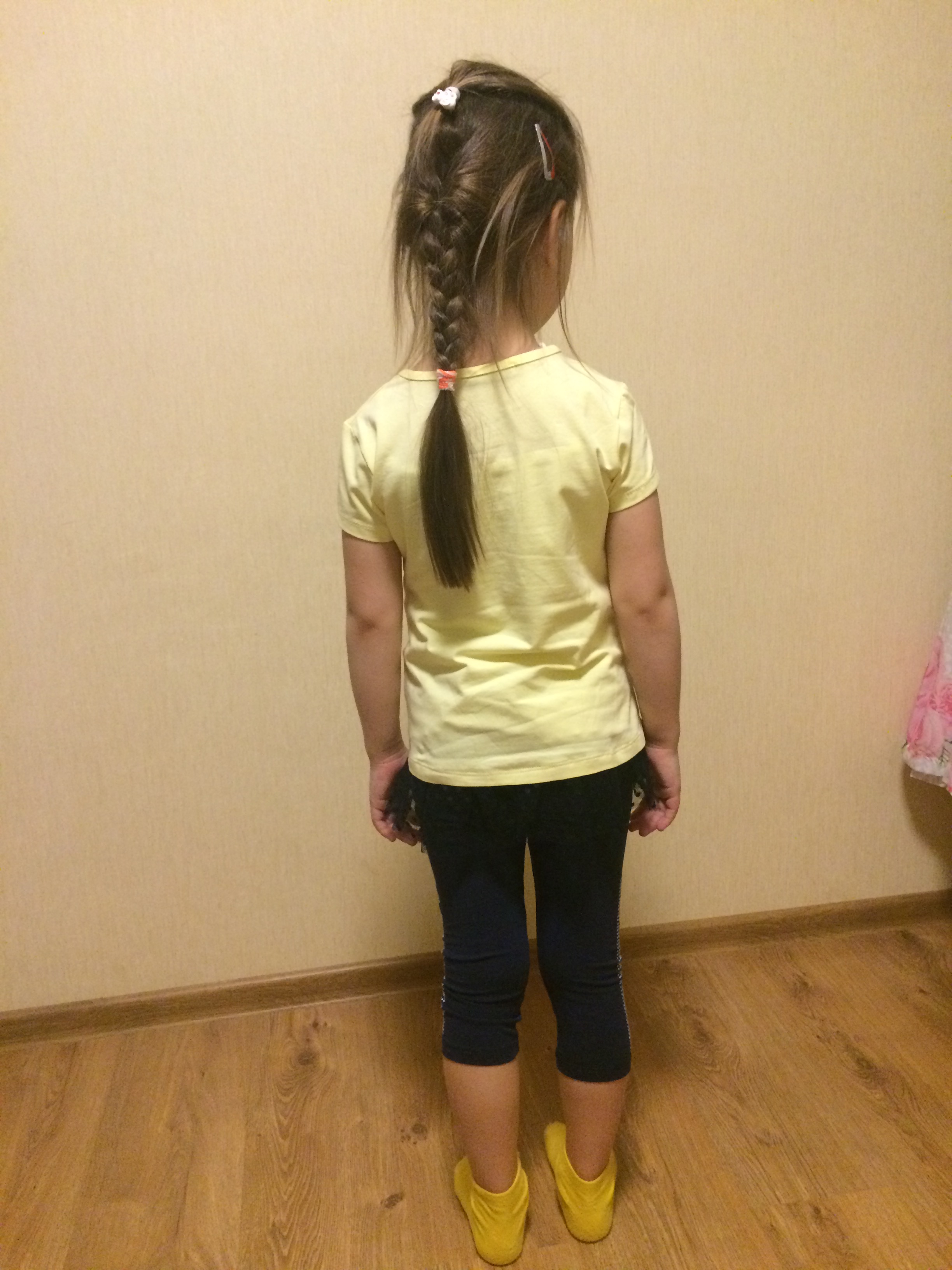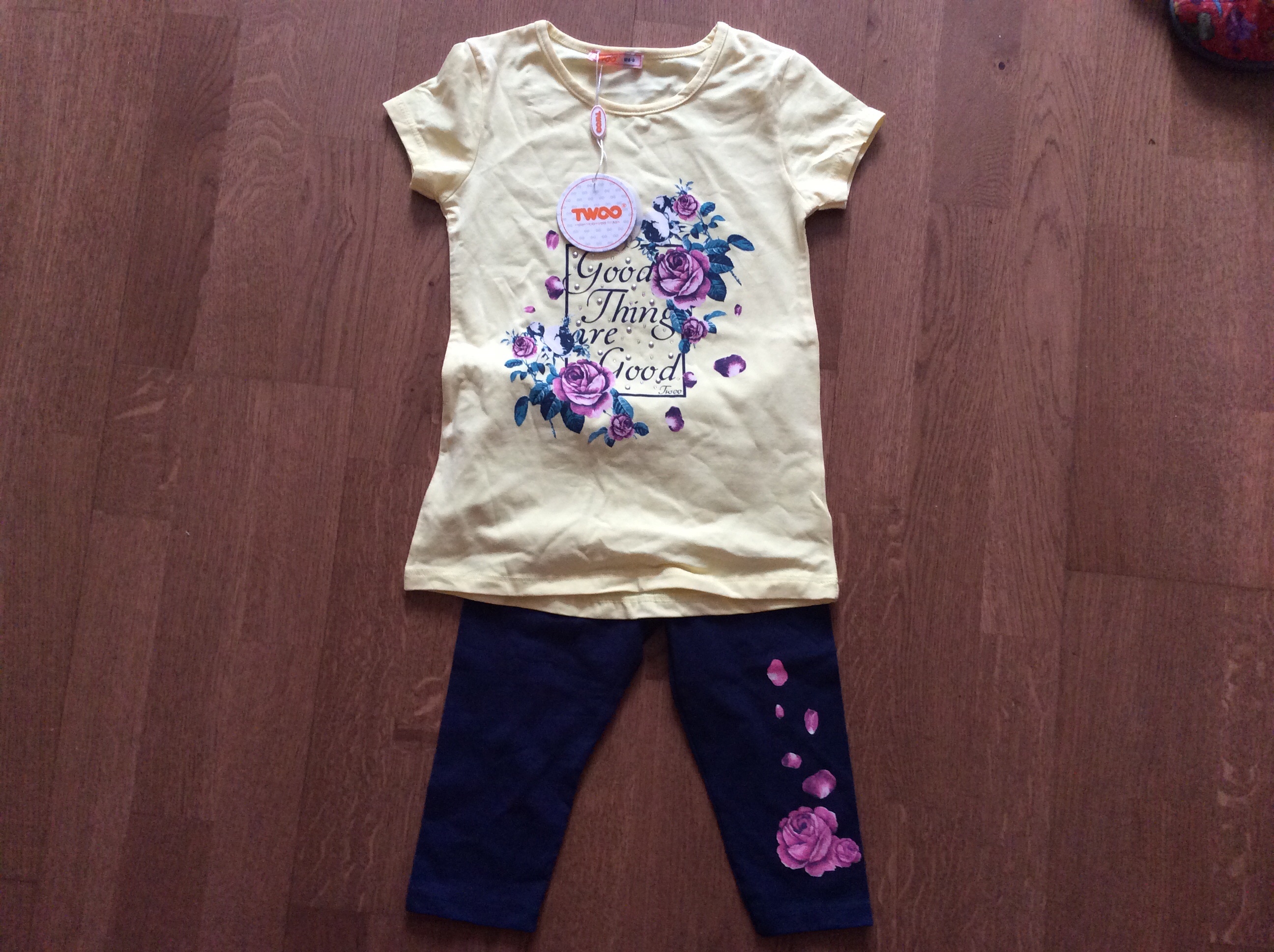 Футболка желтая с лосинами. Размер 7лет. Я бы взяла на размер больше - то есть 8.