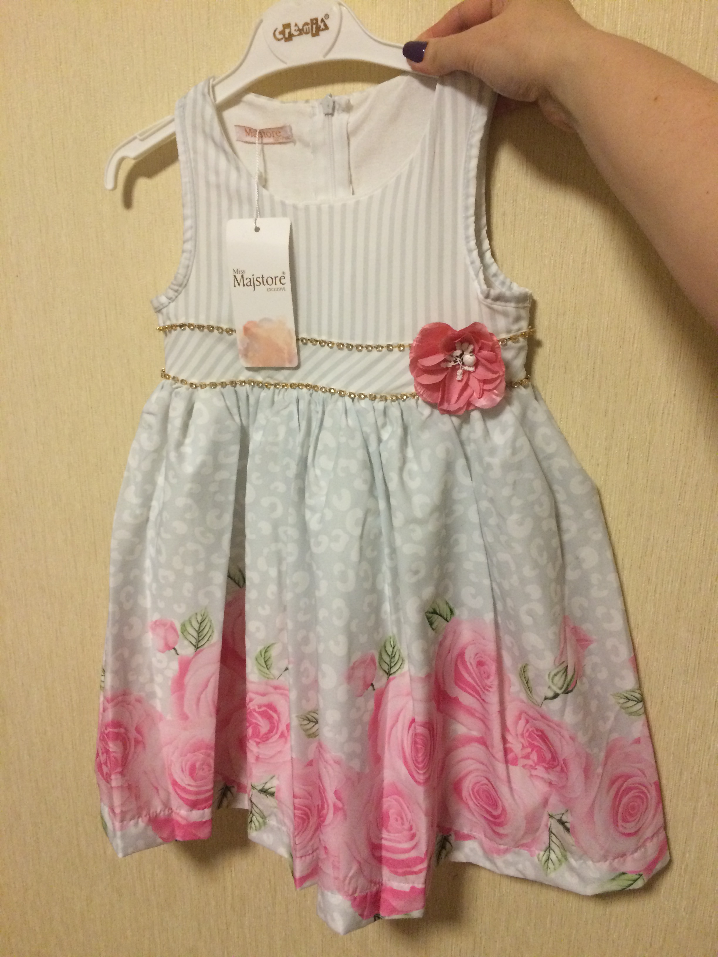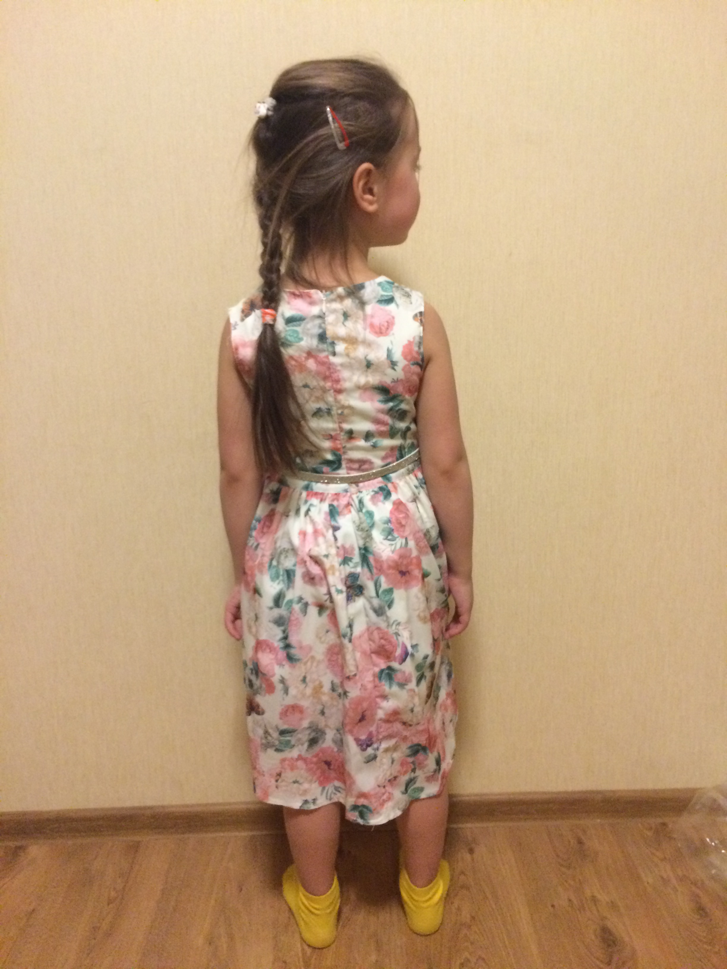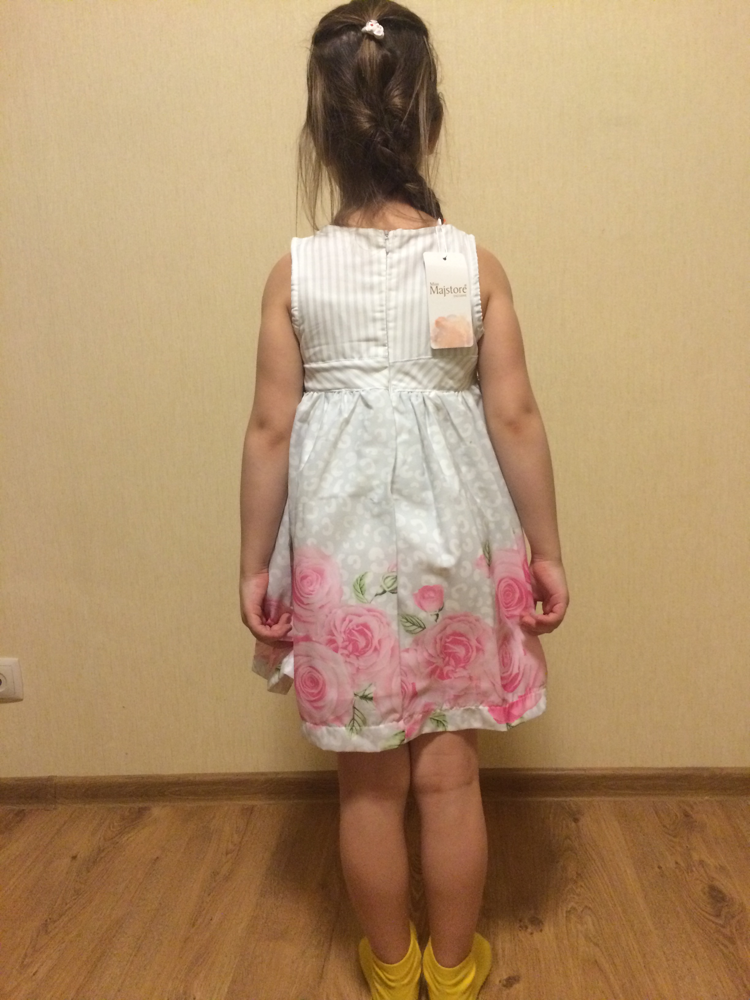Платье с розами и бабочками подошло по размеру. Размер 7 лет. Длина 62-63 см. Полуобхват талии 27-28 см.