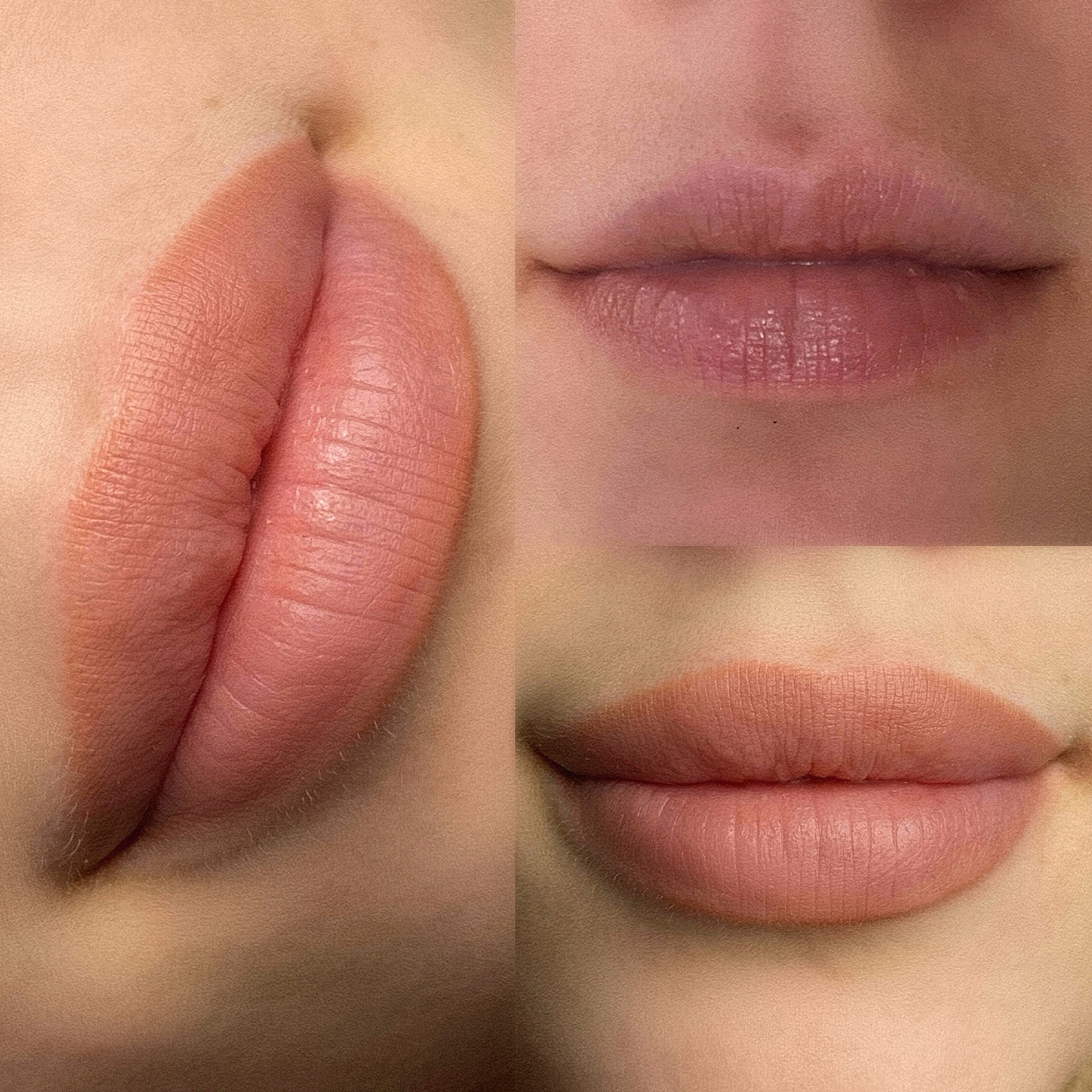На губах перманентный макияж (бежевый цвет) , через 3 месяца после процедуры