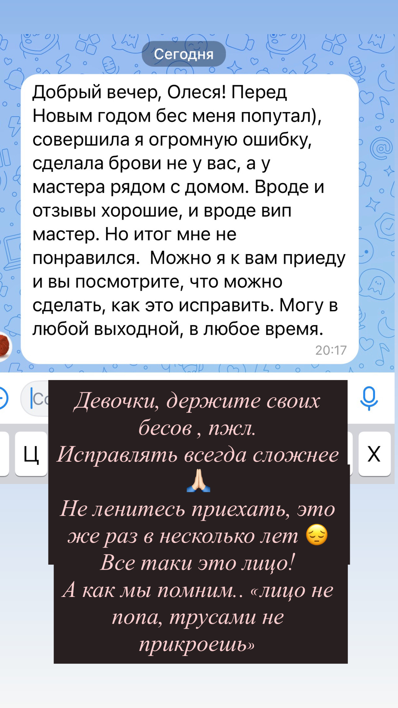 Переодически получаю такие сообщения… Кому-то лень ехать, кто-то нашел дешевле ( потом оплатит больше на переделке) , кому-то хочется сразу , а не ждать 2-3 недели ( такая у меня запись)