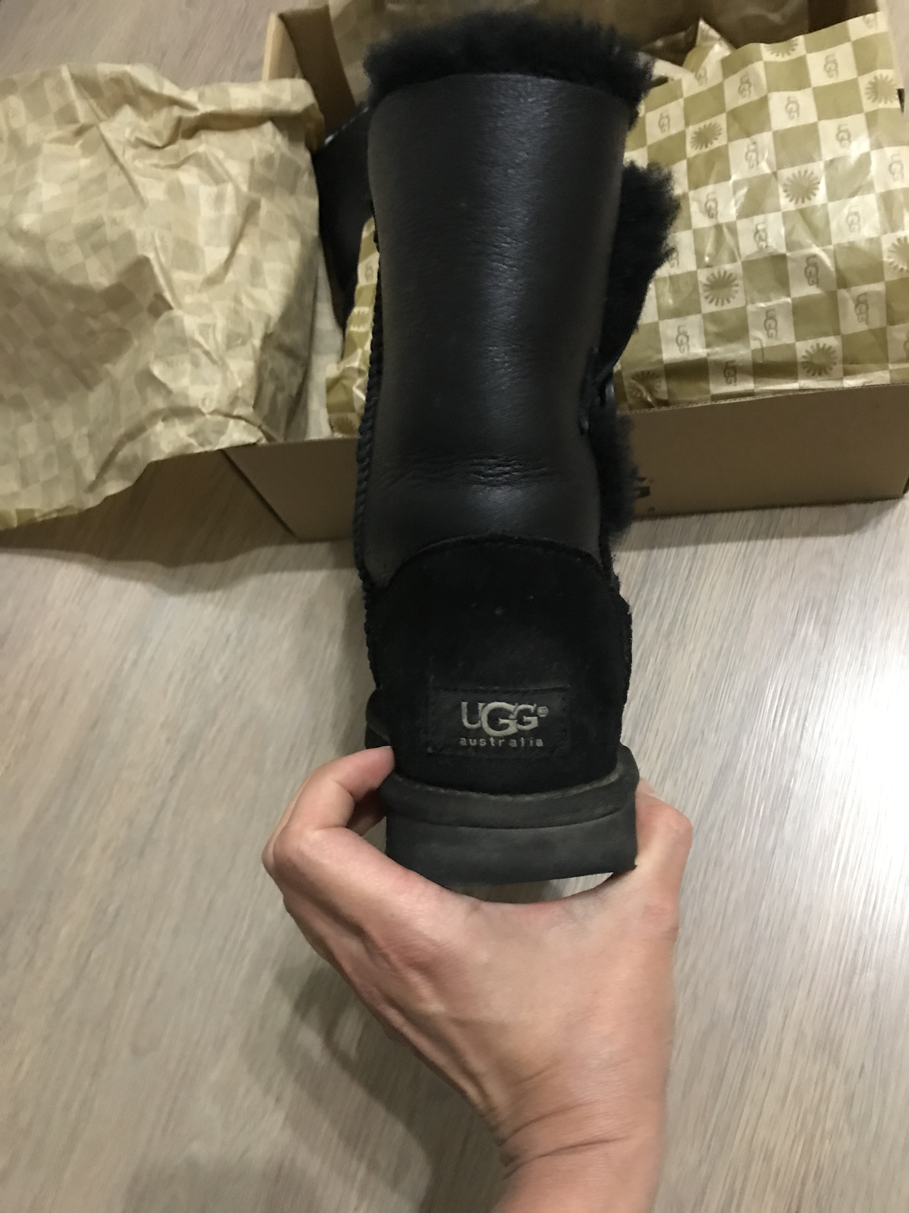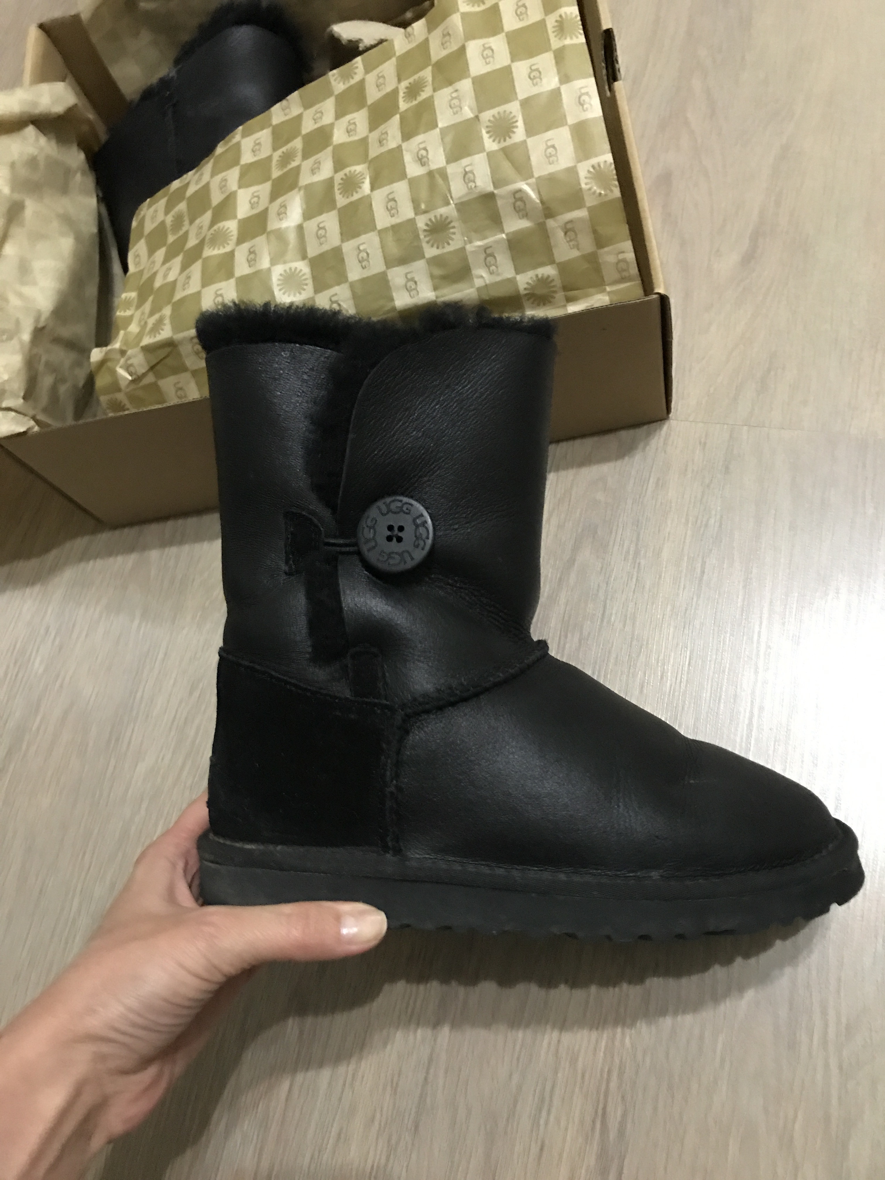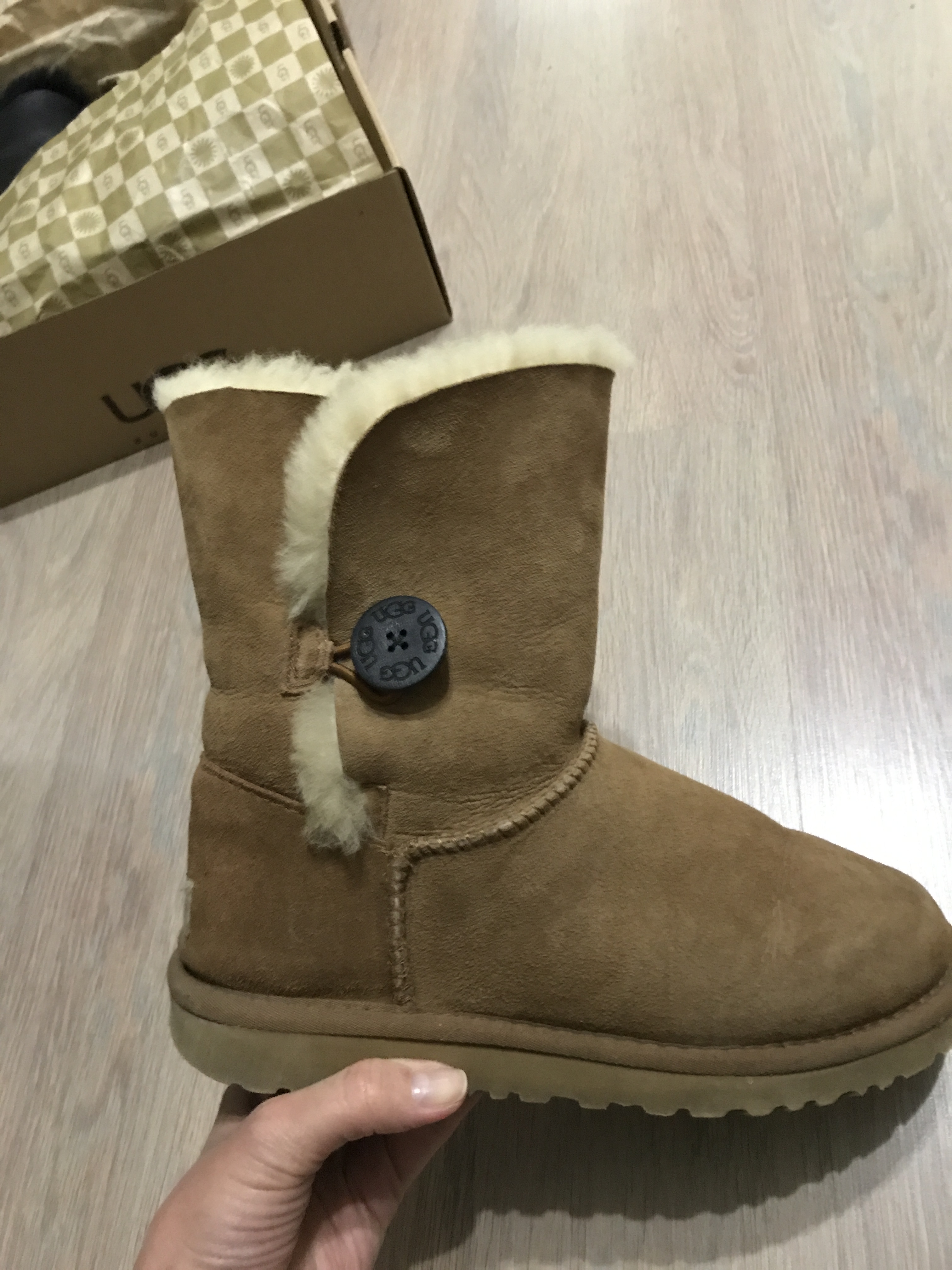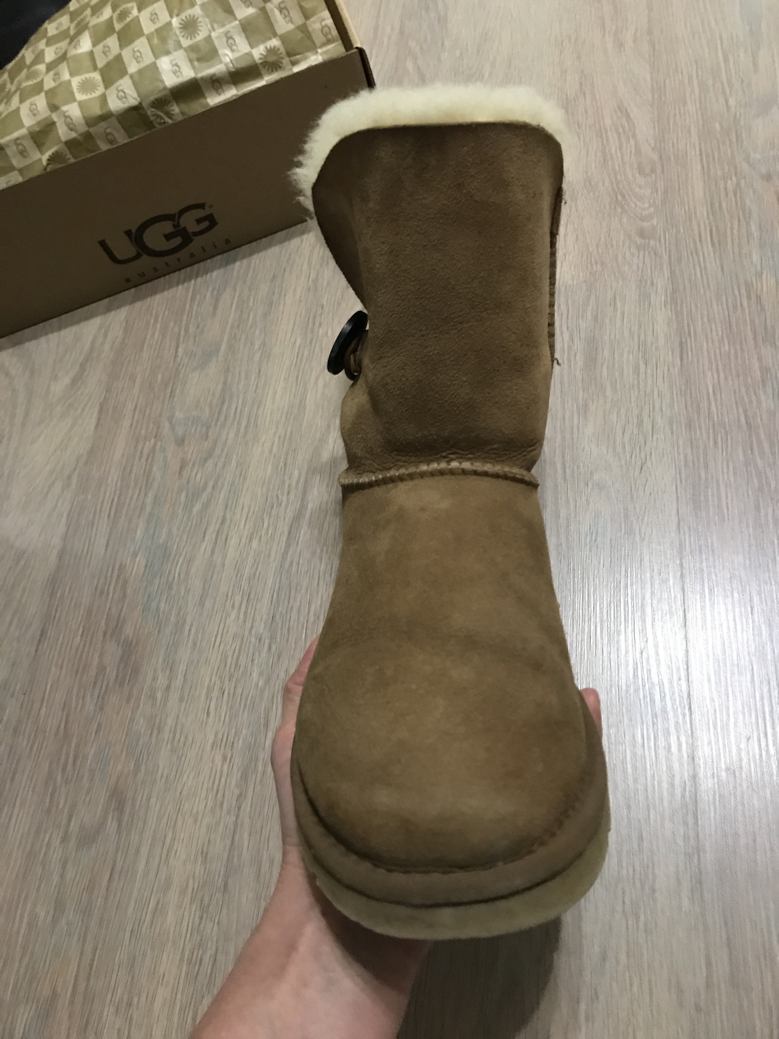 Хочу написать отзыв об уггах из Юлиной закупки. Свою 1-ю пару угг Bailey Button я купила у Юли еще осенью 2014 года, и не пришла бы еще долго, если бы на прогулке по лесу по неосторожности не напоролась на толстую ветку под снегом и не порвала левый сапог в районе большого пальца. В мастерской, к сожалению, их не взяли на ремонт. Работа сложная.
