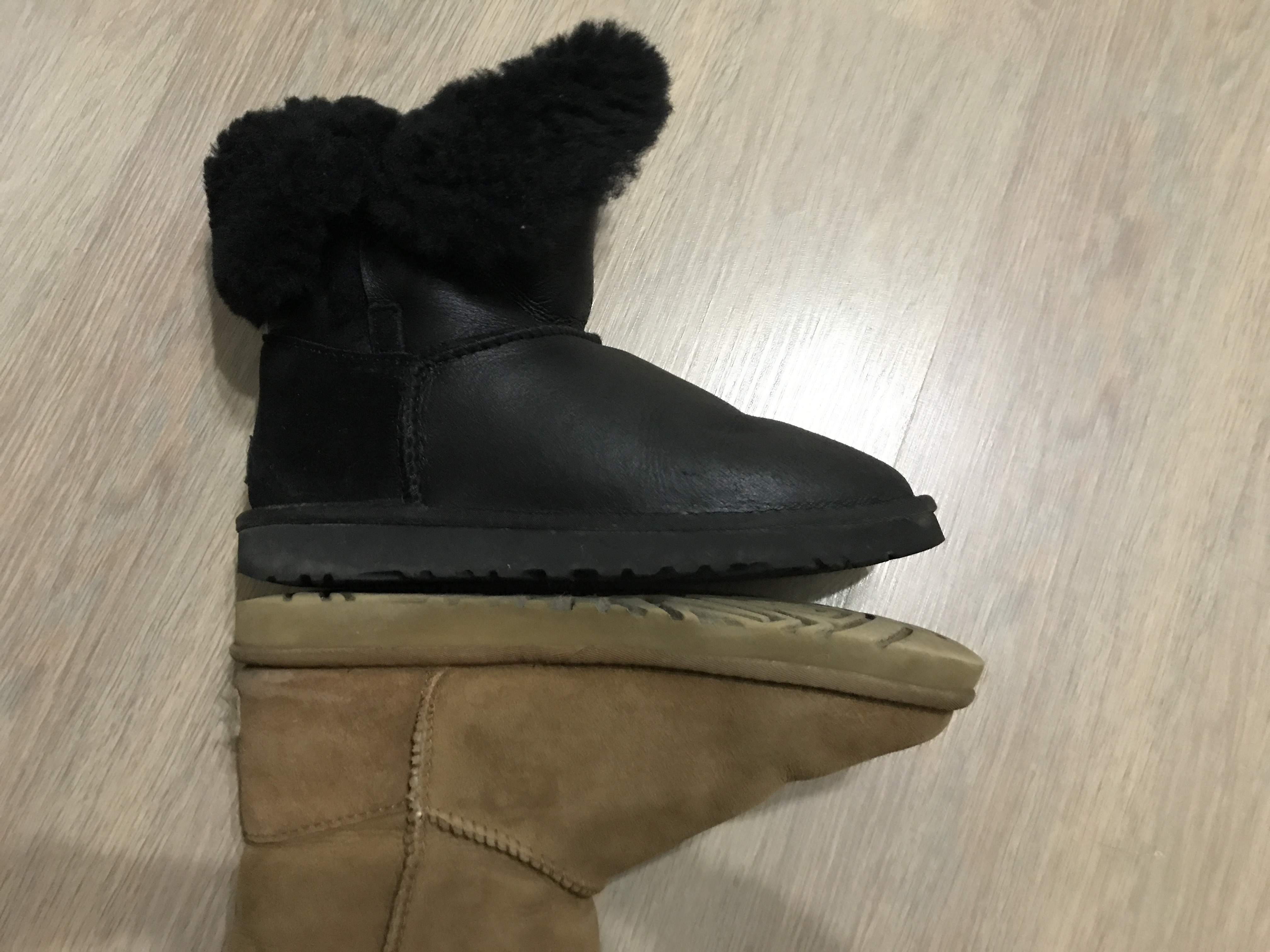 Есть разница по длине подошвы между 2 парами, обливные короче классических на 3-4 мм, это видно на фото. Длина классических угг по внешней стельке 27 см. Поэтому новая пара села чуть плотнее, придется ее немного подразносить.