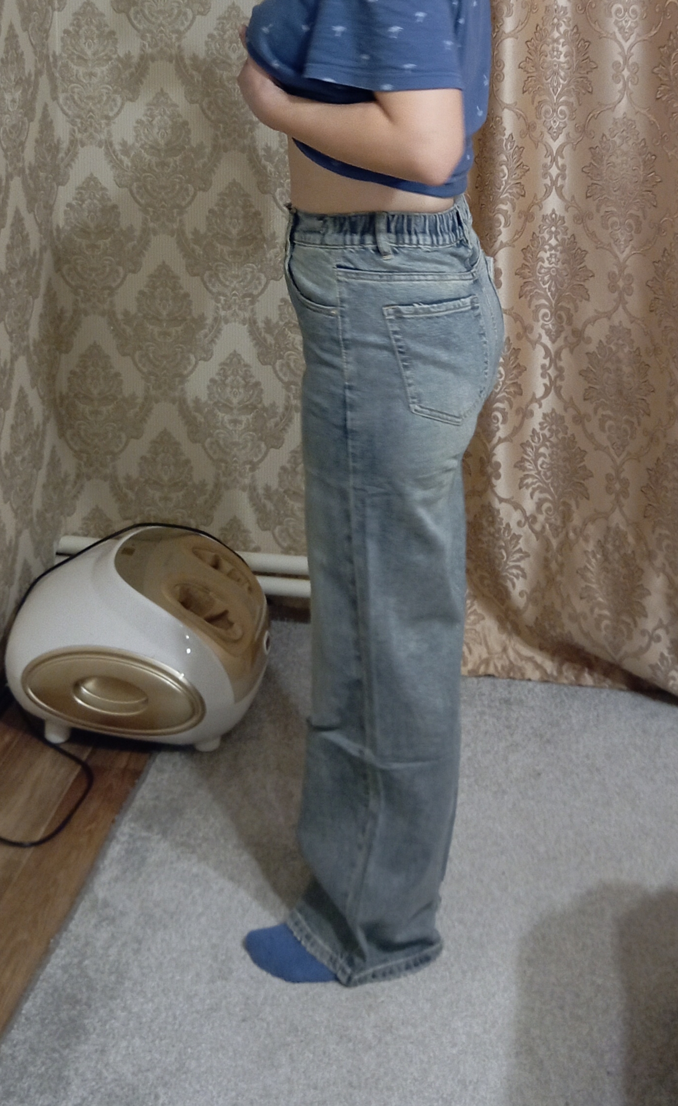 Джинсы Маша получила 30 и 31, размер почти не отличается. Младшей дочери пошли обе пары. Джинса более тяжелая, хоть и эластичная. Удобно, что пояс на резинке.