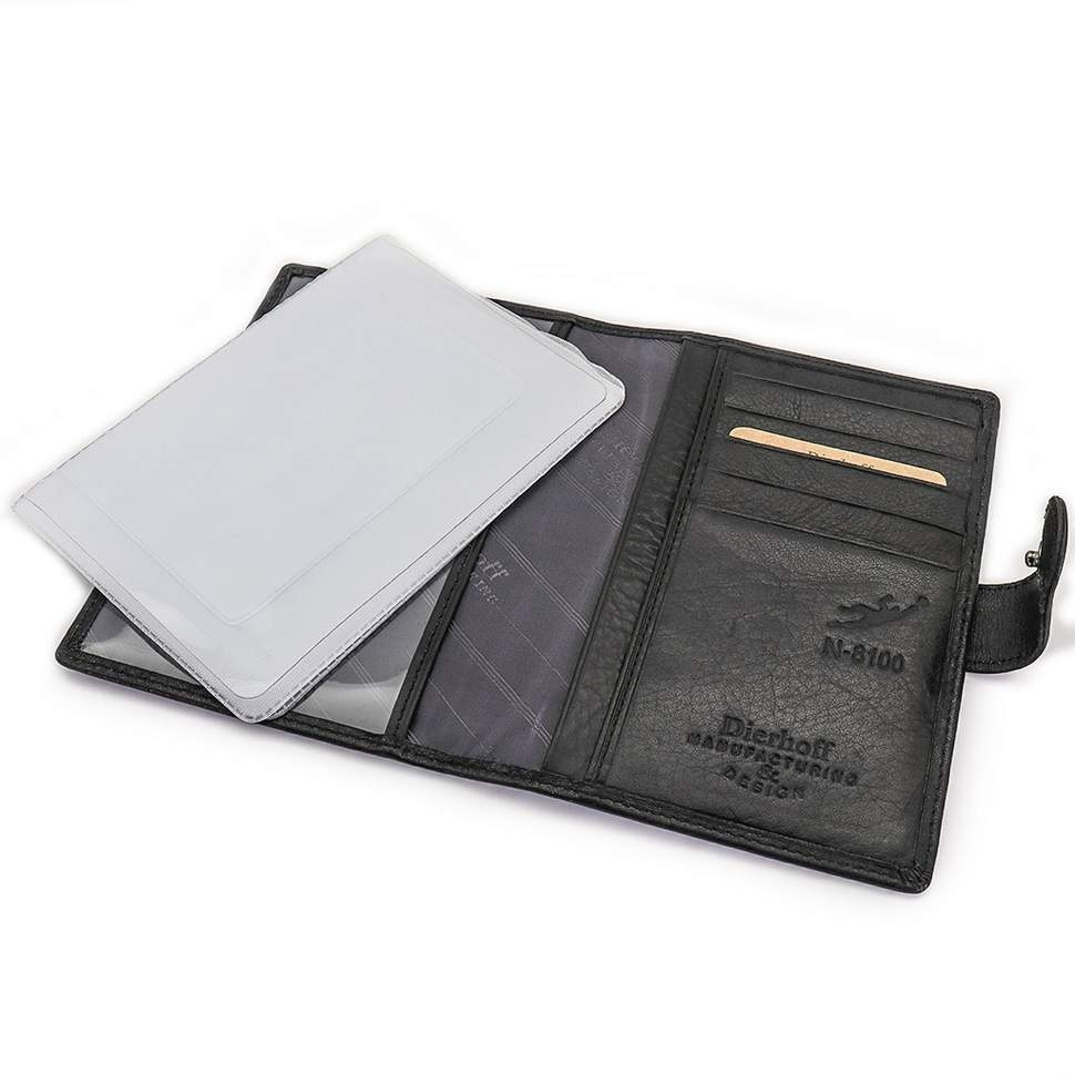 Описание: Мужская кожаная обложка для паспорта от Dierhoff. Внутри два прозрачных захвата и два кожаных кармашка.