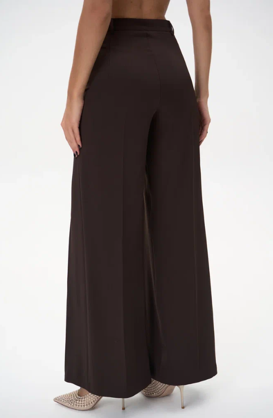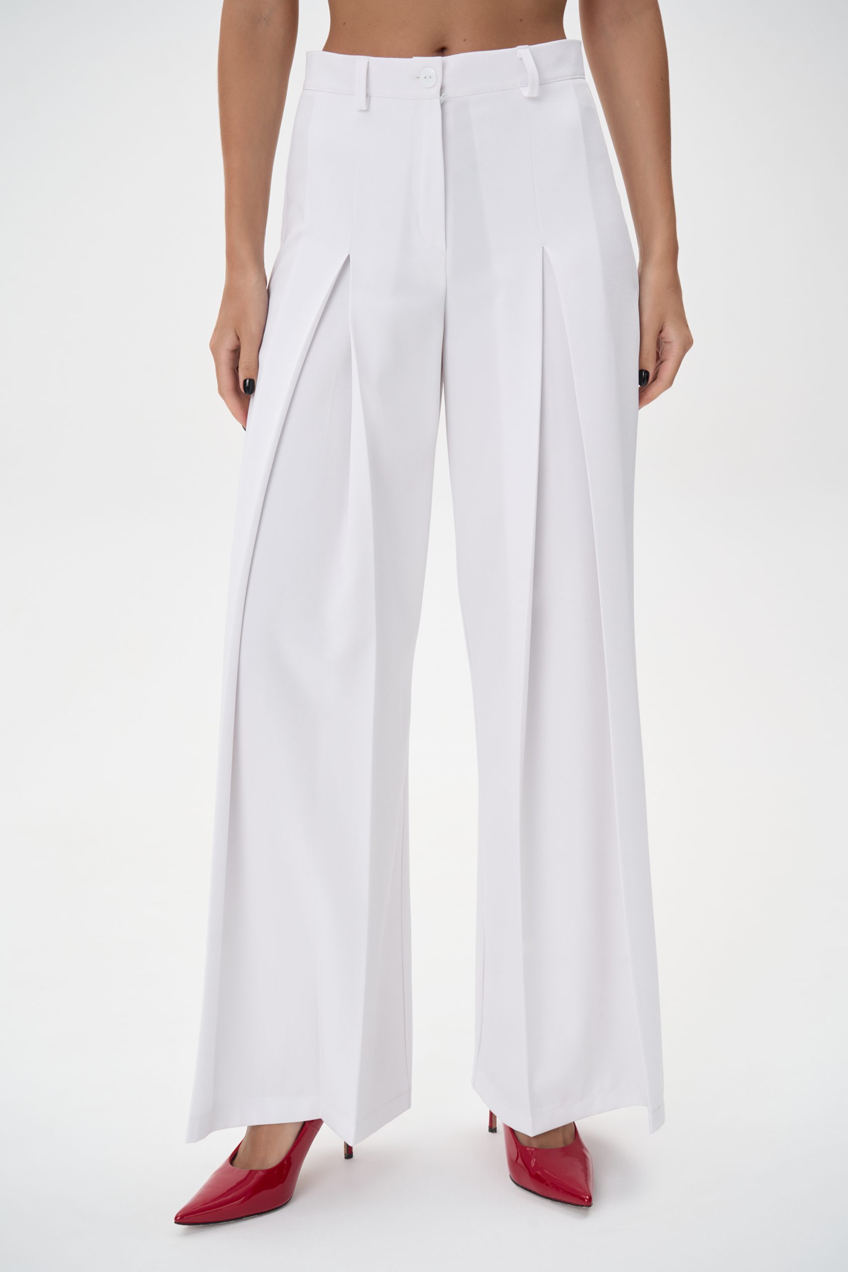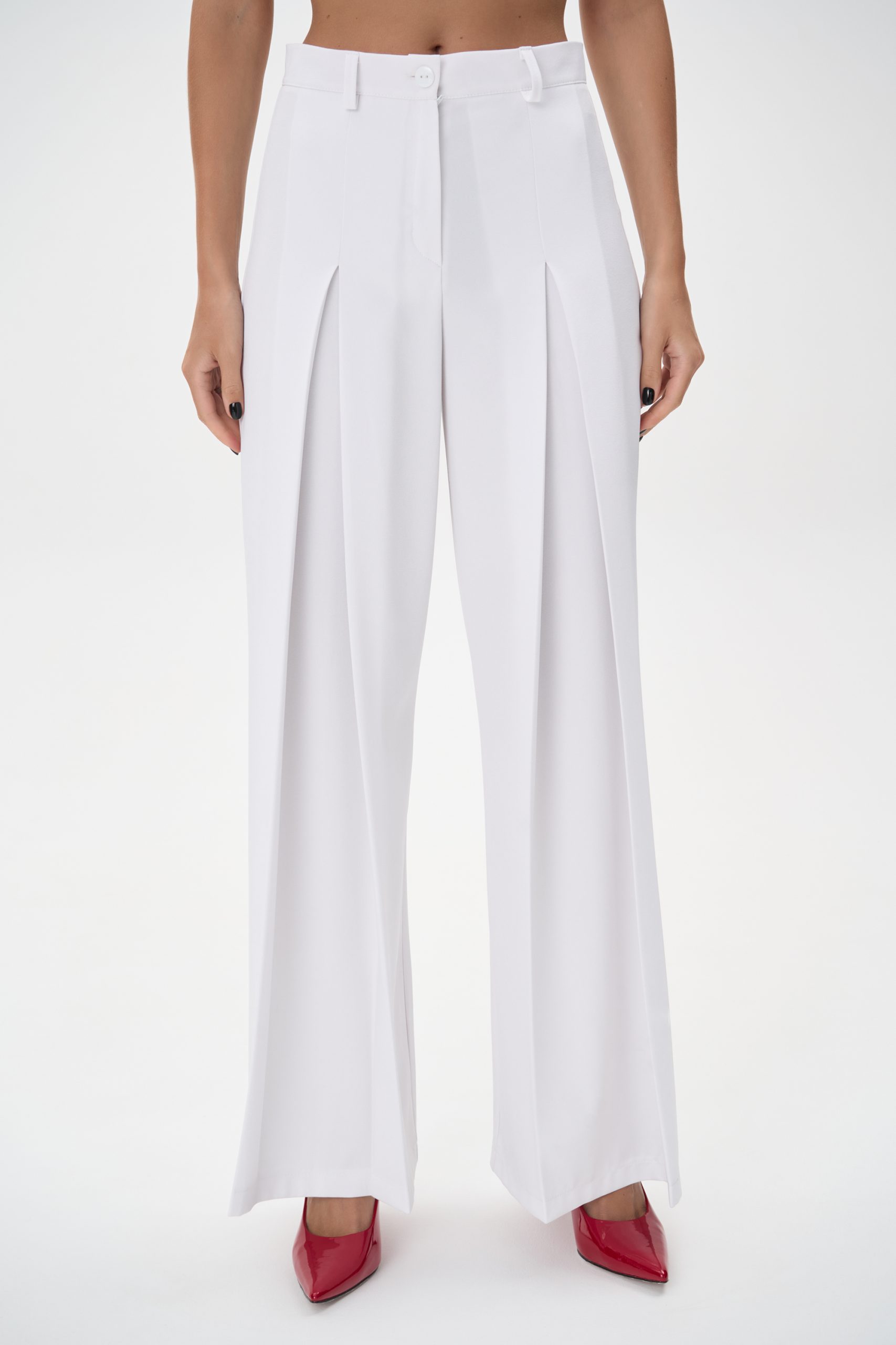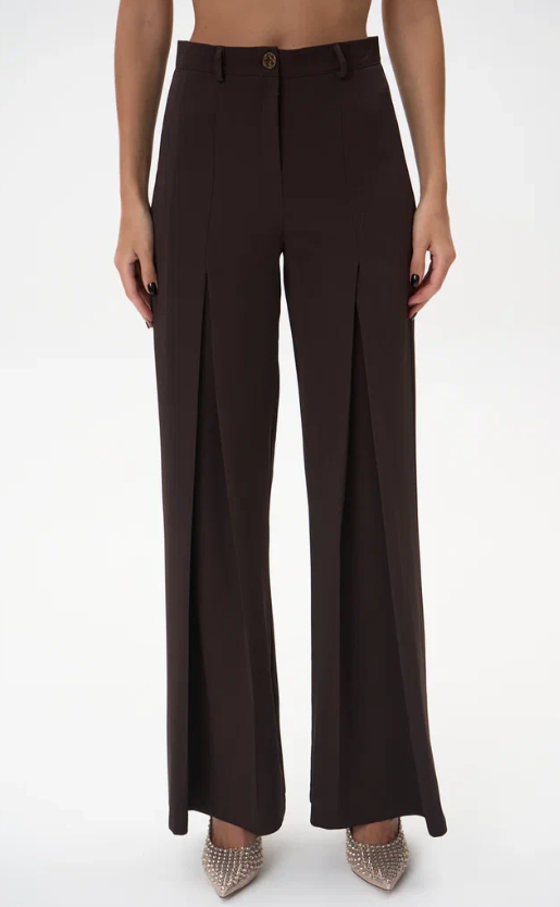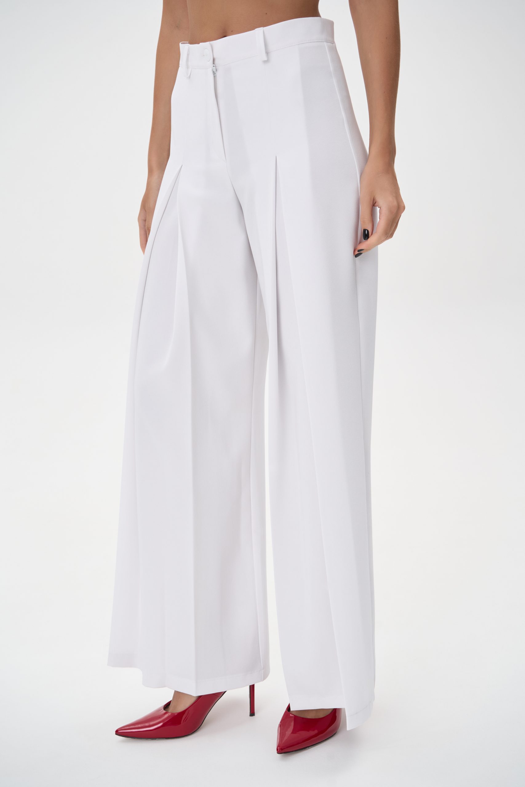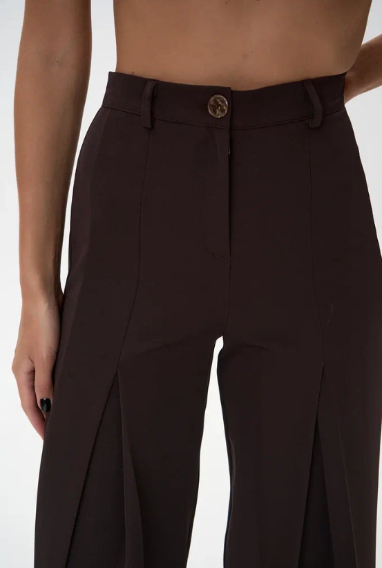 Модель имеет высокую посадку, подчёркивающую линию талии и визуально удлиняющую силуэт. Передние заутюженные стрелки и глубокие встречные складки добавляют брюкам динамики и визуального объёма, создавая утончённый, но современный образ.