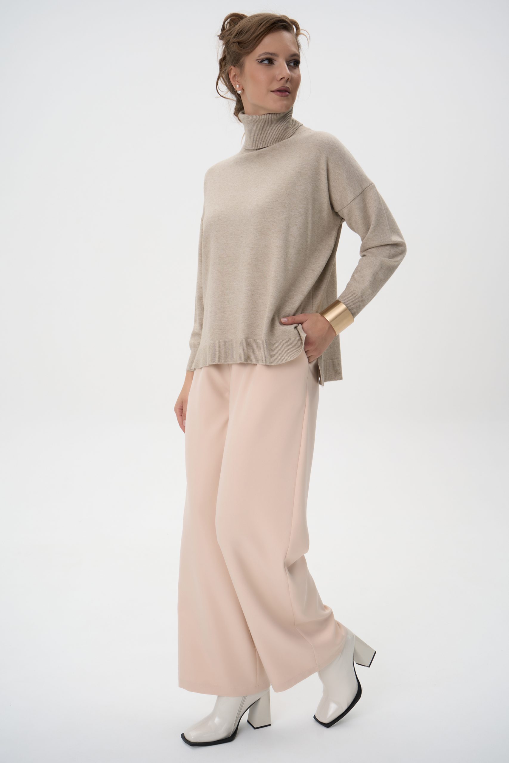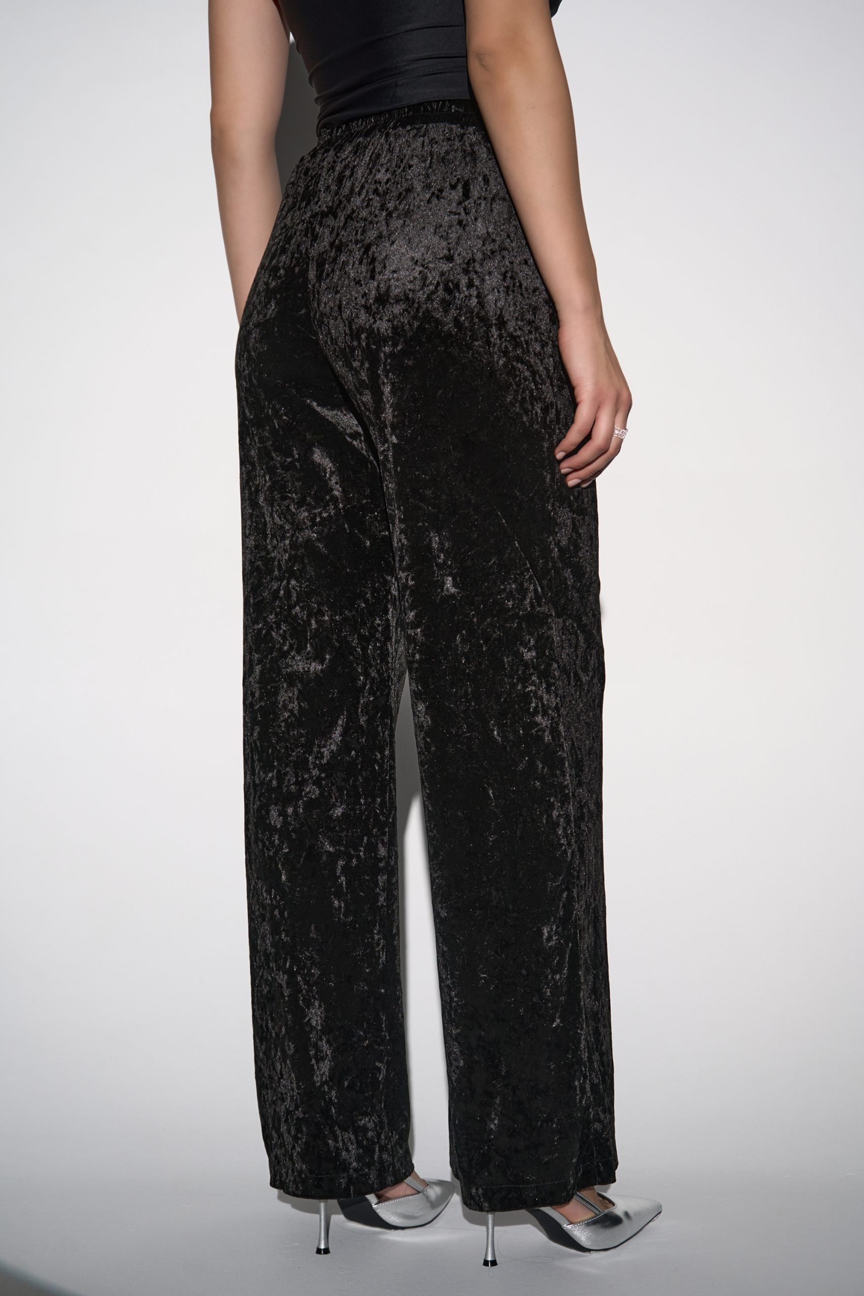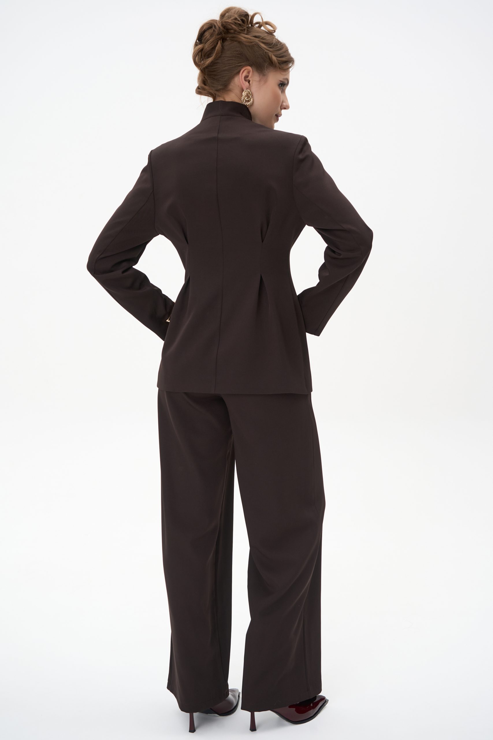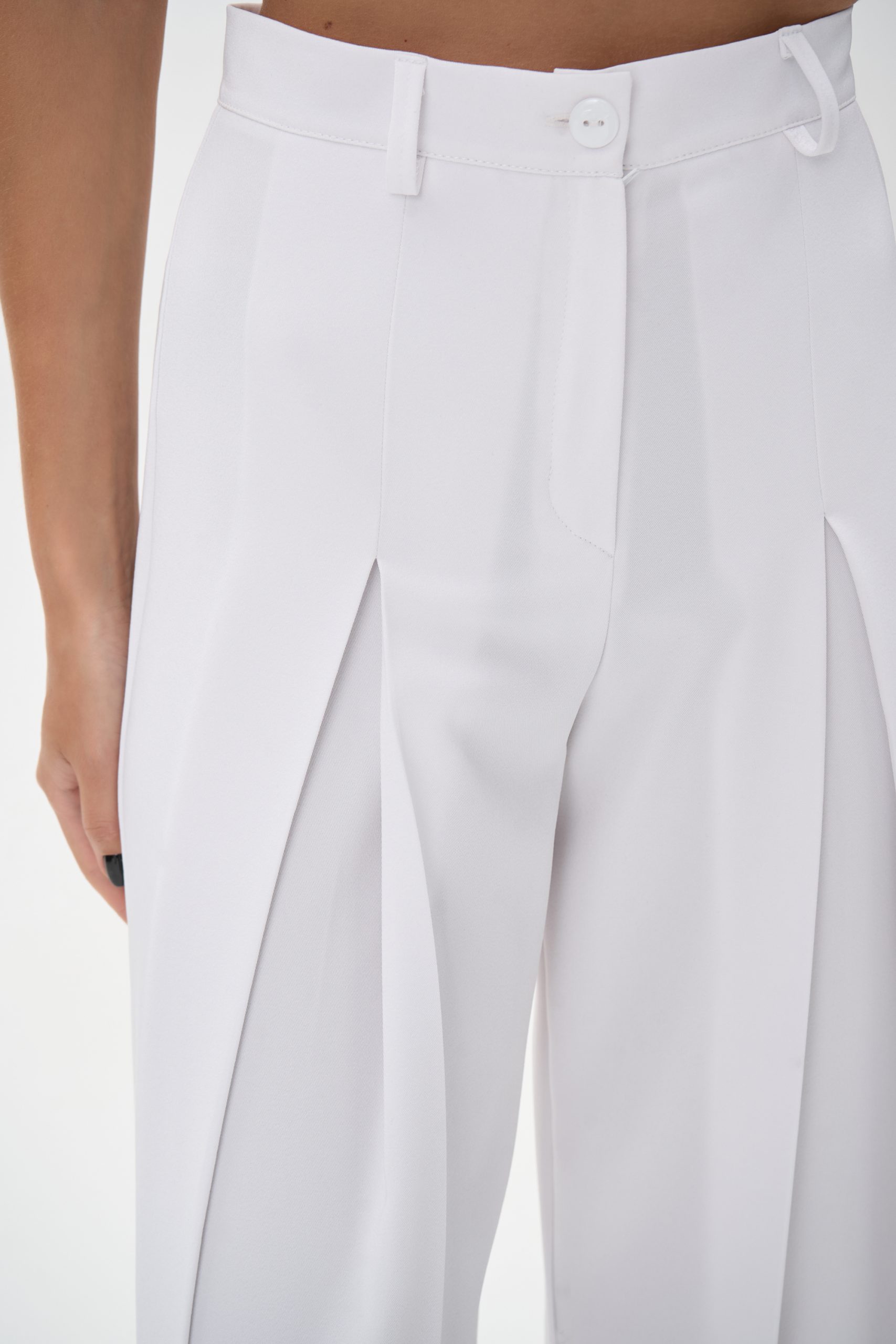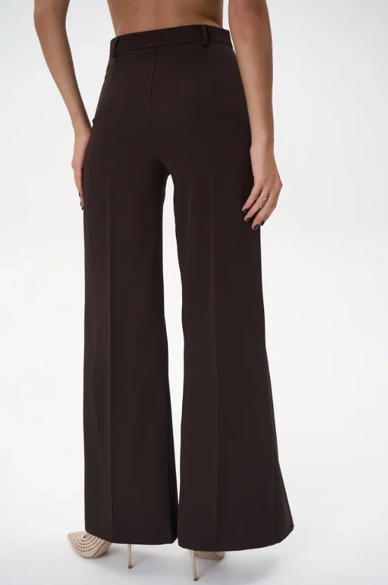 Модель имеет высокую посадку, подчёркивающую линию талии и визуально удлиняющую силуэт. Передние заутюженные стрелки и глубокие встречные складки добавляют брюкам динамики и визуального объёма, создавая утончённый, но современный образ.