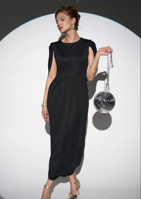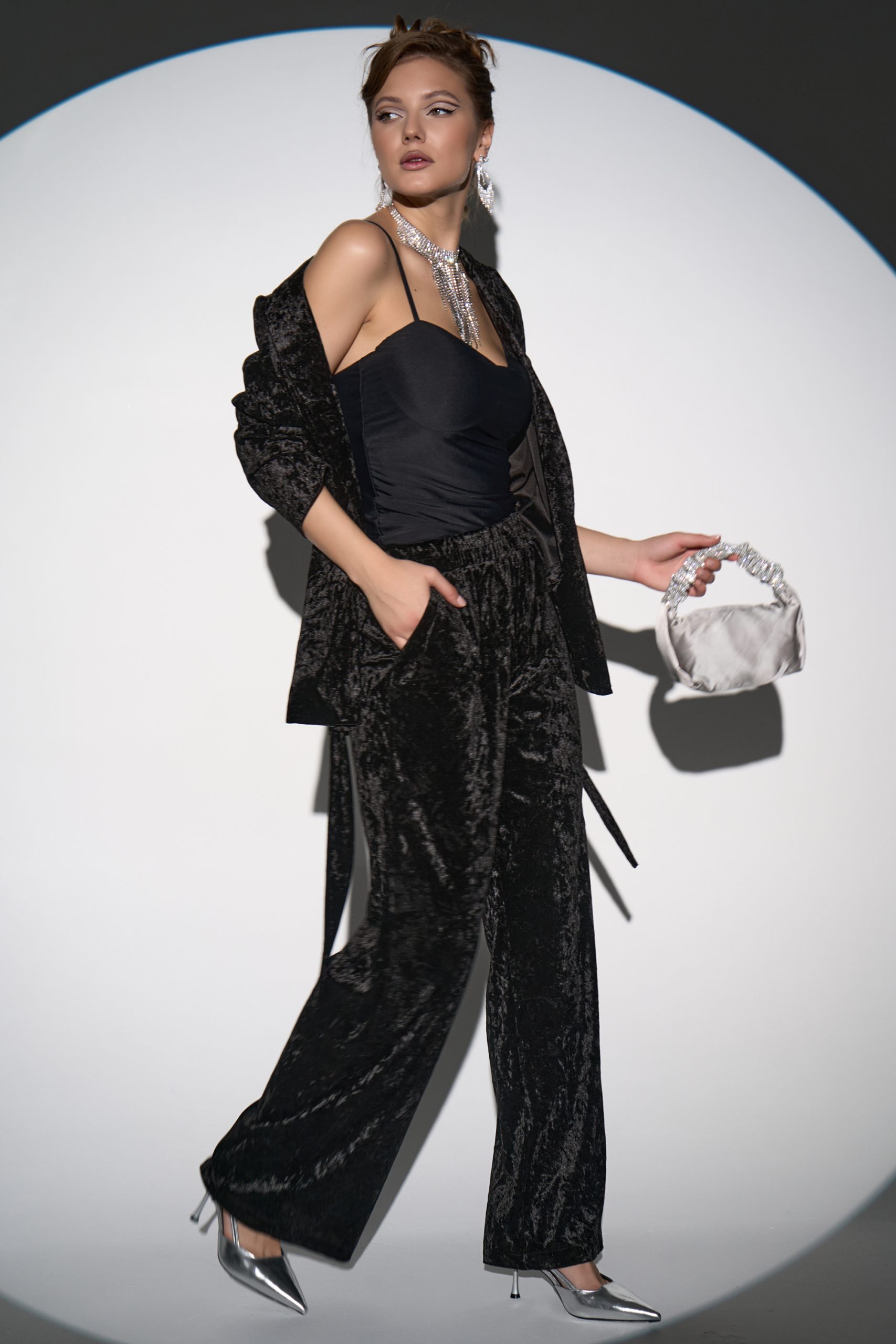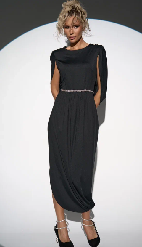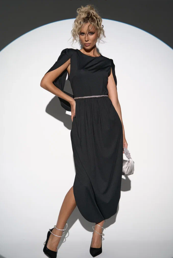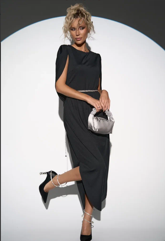 Лёгкий и свободный крой дает впечатление лёгкости и изящества. Глубокий V-образный вырез подчёркивает шею и линию декольте, а пояс на талии позволяет регулировать посадку, делая силуэт более женственным. Бархат придаёт образу мягкое сияние и ощущение роскоши, а минималистичный дизайн делает его универсальным для вечера или торжества.