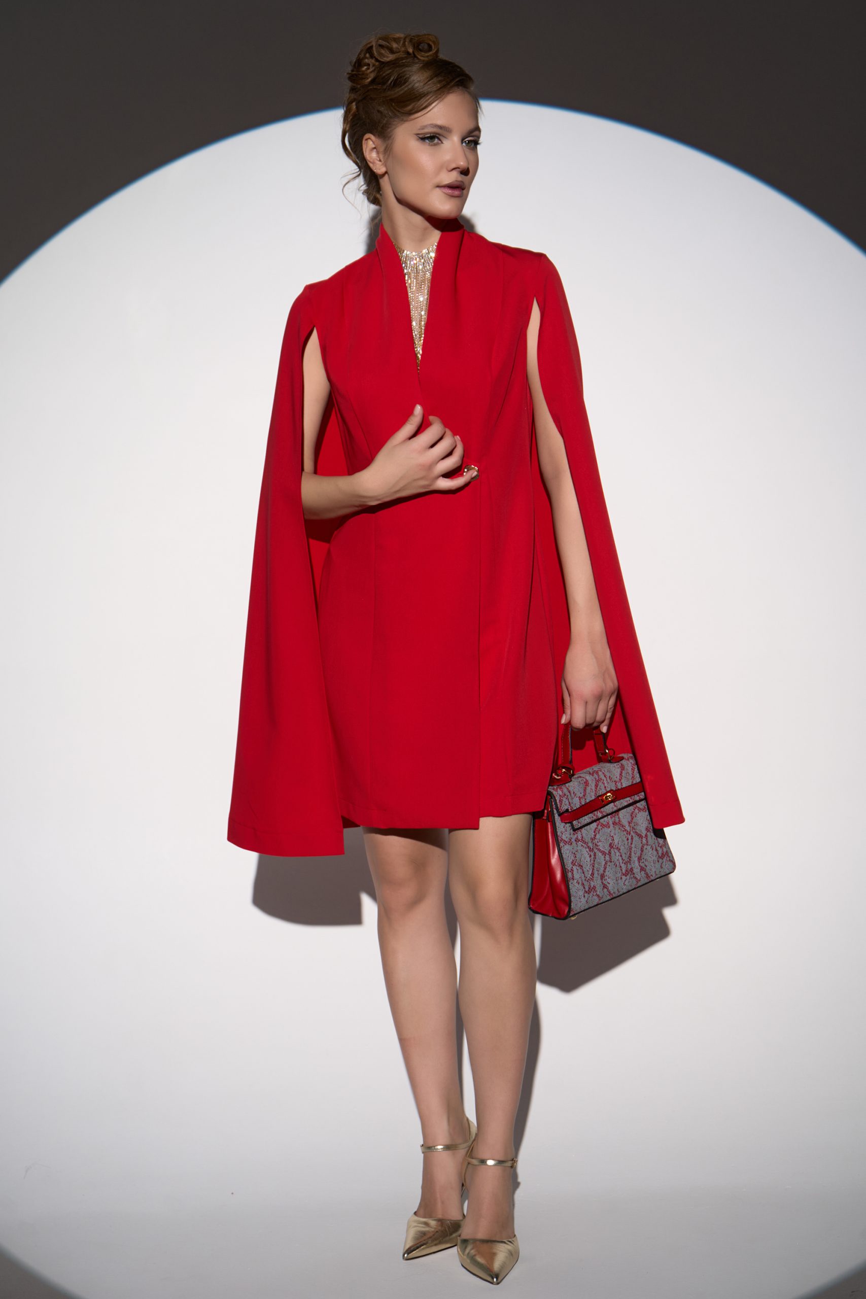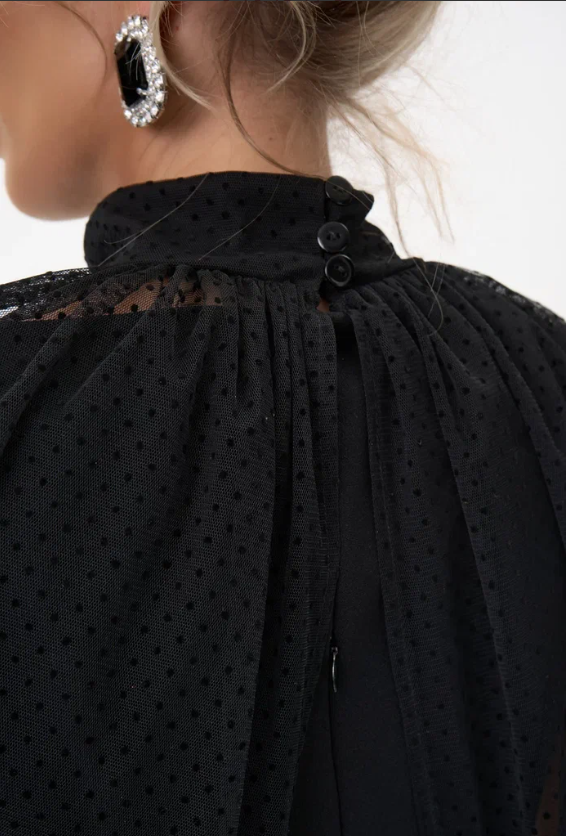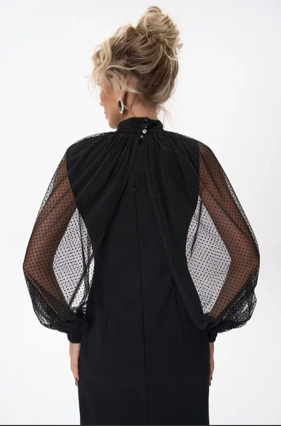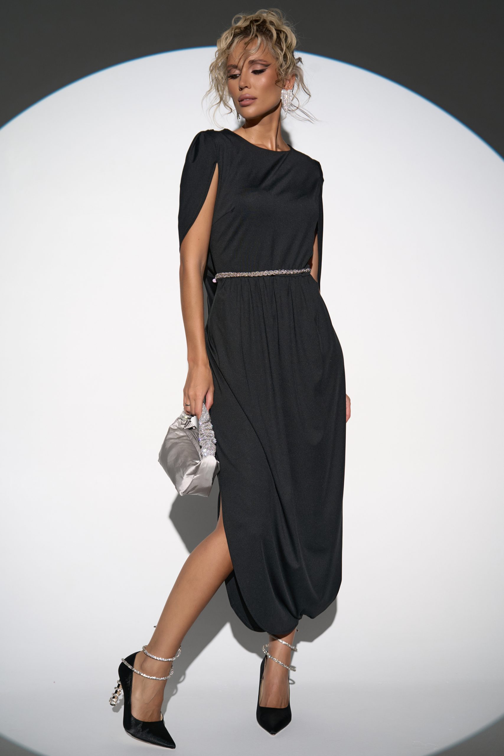 Лёгкий и свободный крой дает впечатление лёгкости и изящества. Глубокий V-образный вырез подчёркивает шею и линию декольте, а пояс на талии позволяет регулировать посадку, делая силуэт более женственным. Бархат придаёт образу мягкое сияние и ощущение роскоши, а минималистичный дизайн делает его универсальным для вечера или торжества.
