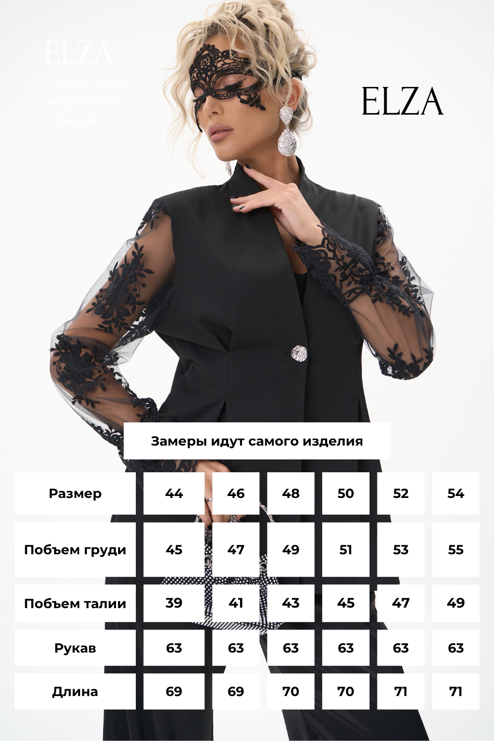 Размерная сетка: Размер 44: грудь: 88, талия:70, бедра:96.Размер 46: грудь: 92, талия:74, бедра:100.Размер 48: грудь: 96, талия:78, бедра:104.Размер 50: грудь: 100, талия:82, бедра:108.Размер 52: грудь: 104, талия:87, бедра:112.Размер 54: грудь: 108, талия:91, бедра:116.Размер 56: грудь: 112, талия:95, бедра:120.Размер 58: грудь: 116, талия:99, бедра:124.Размер 60: грудь: 120, талия:105, бедра:128.