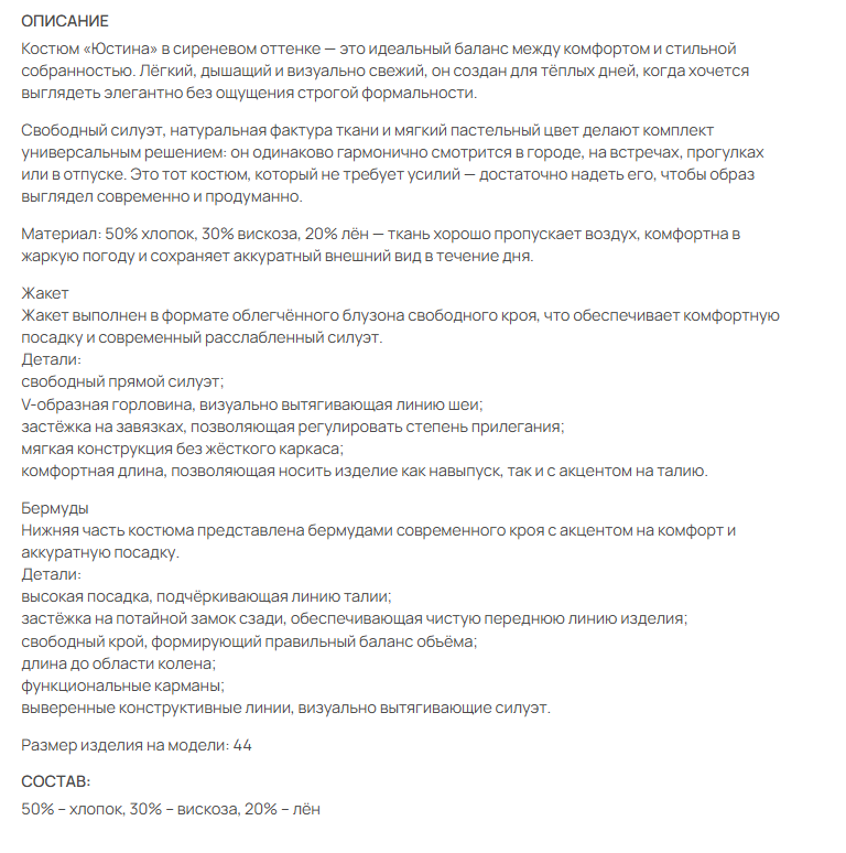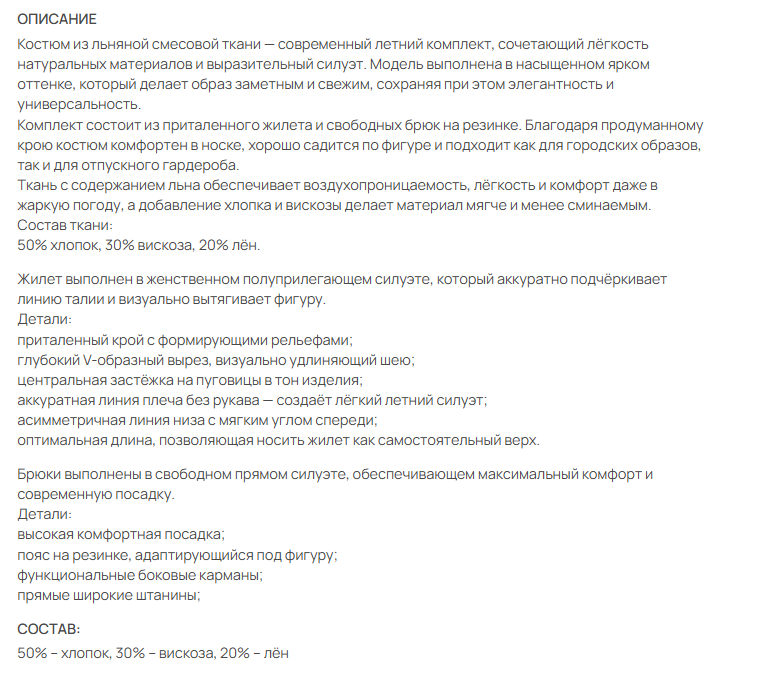 Лаконичный сарафан из натурального льна — идеальный баланс комфорта, женственности и современного силуэта. Модель создана для тёплого сезона: лёгкая, дышащая ткань и продуманный крой обеспечивают удобную посадку и элегантный внешний вид как для повседневных образов, так и для городских летних выходов.