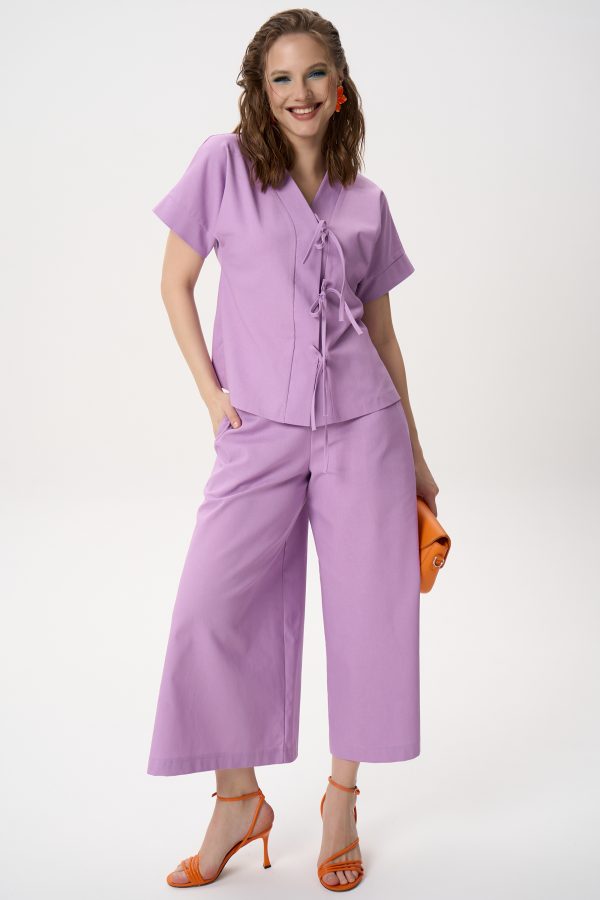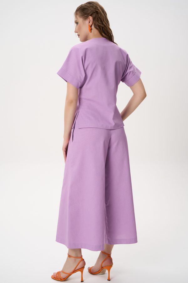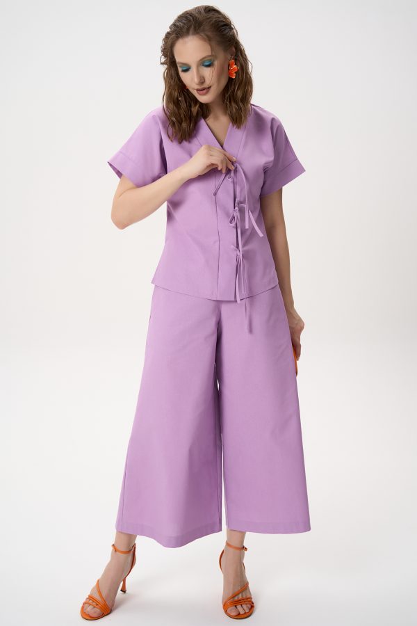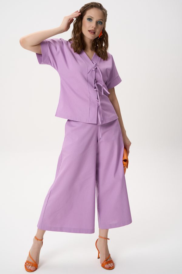 Рубашка свободного кроя и широкие брюки создают ощущение лёгкости и комфорта, при этом силуэт остаётся элегантным.